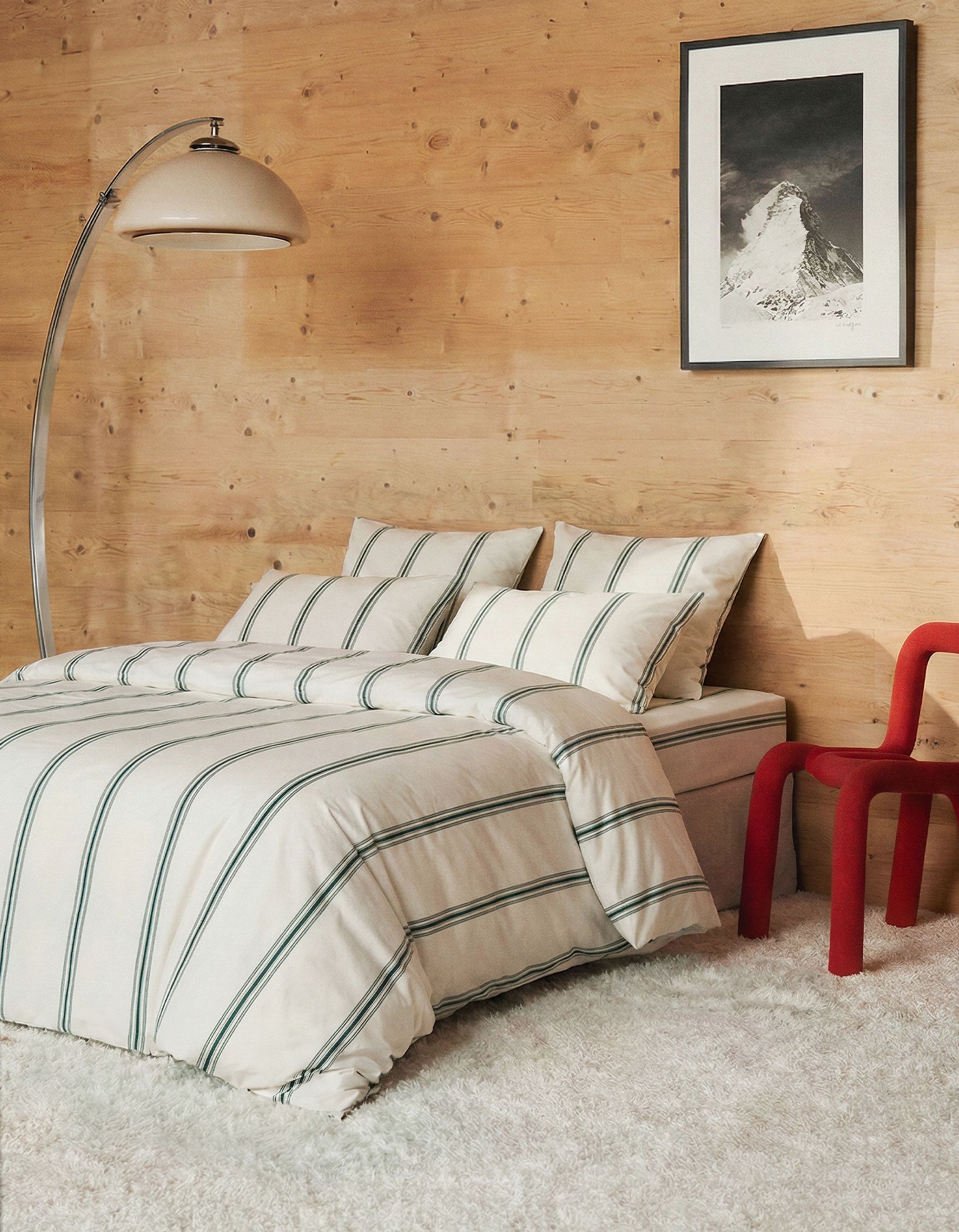 Bois chaleureux, lumière tamisée, matières enveloppantes. L’esprit chalet s’invite dans la chambre pour créer un refuge d’hiver réconfortant.