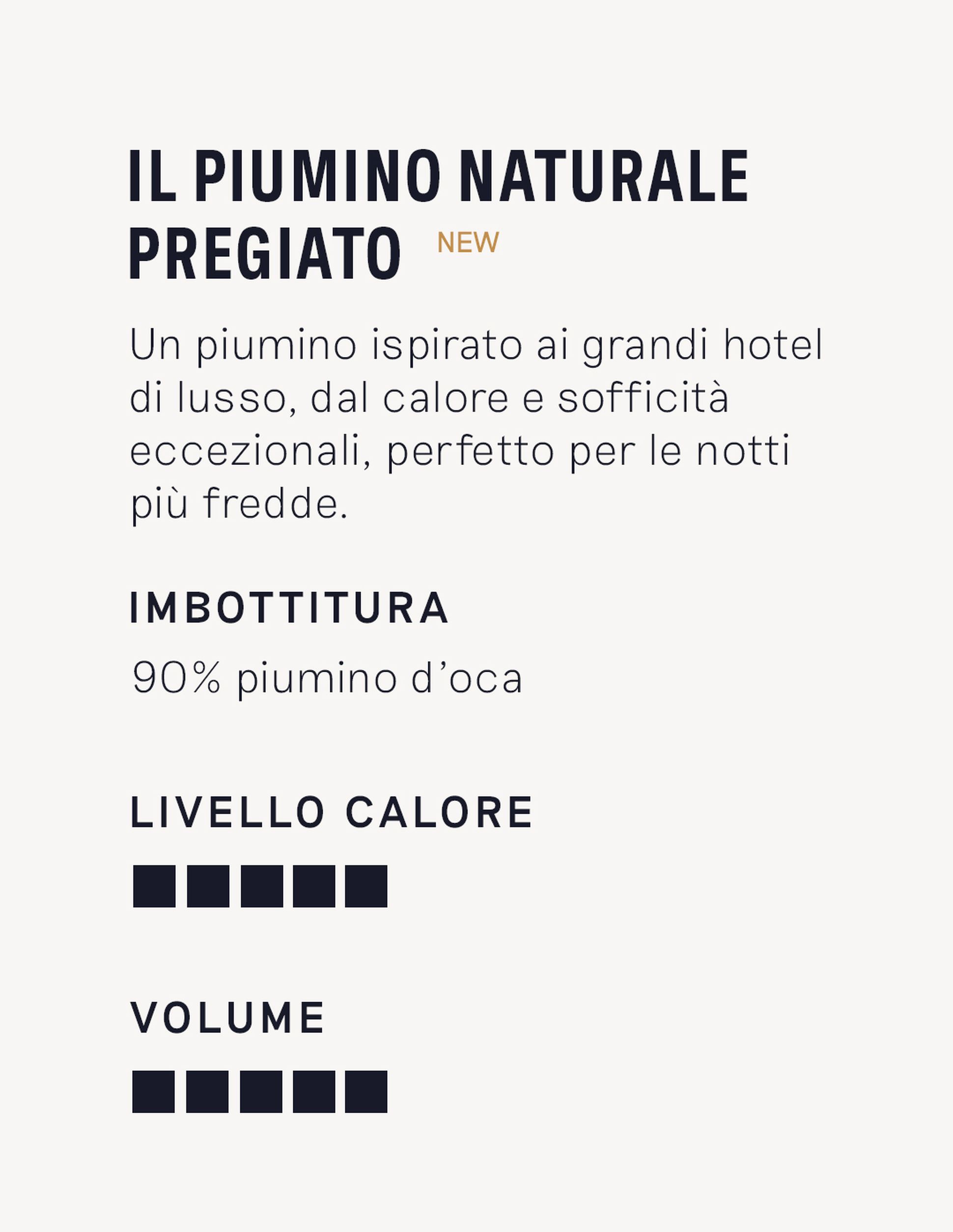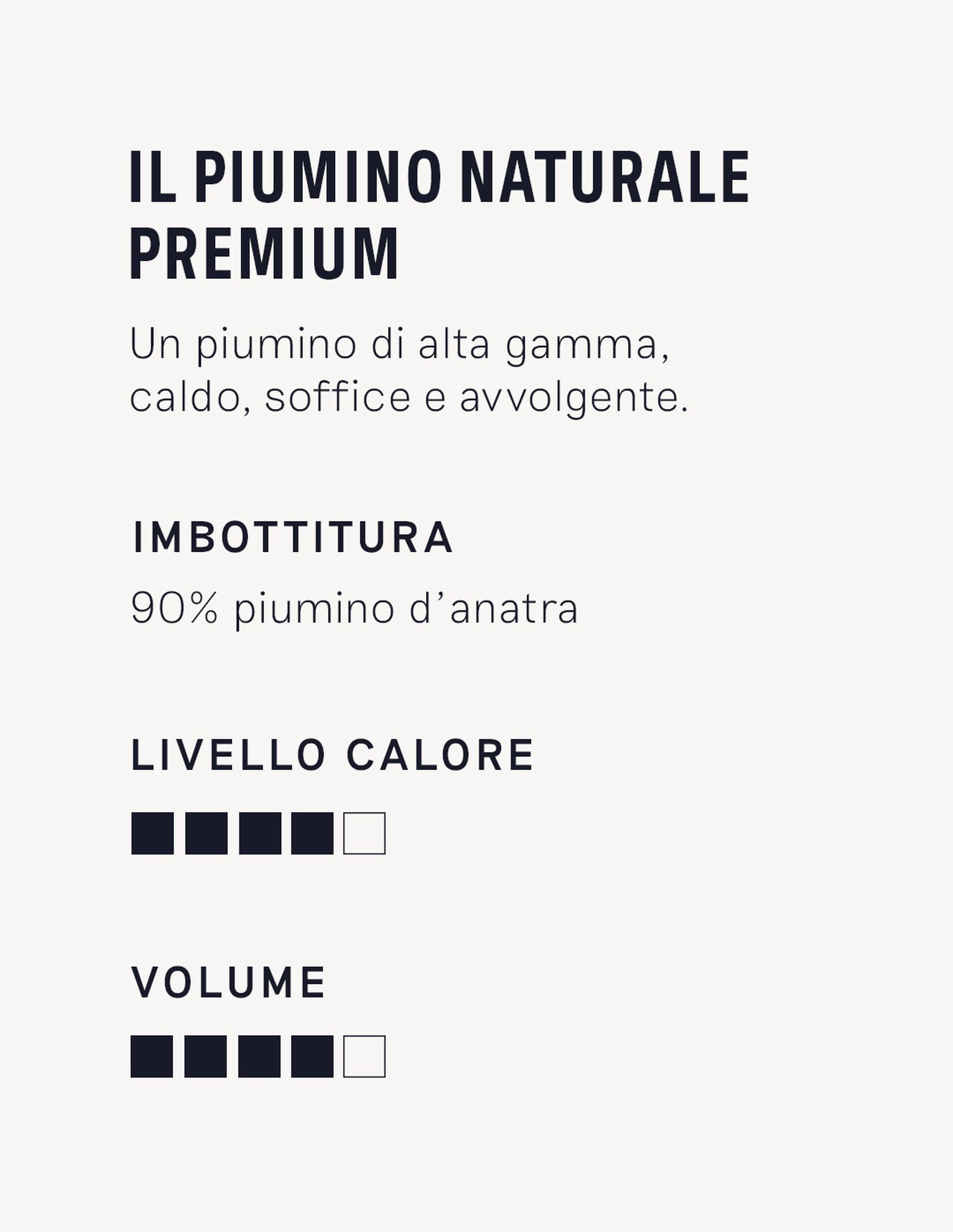 Il piumone 100% naturale in piuma d’anatra, con un peso di 220 g/m². Morbido e soffice, tiene caldo in inverno e resta leggero in estate.