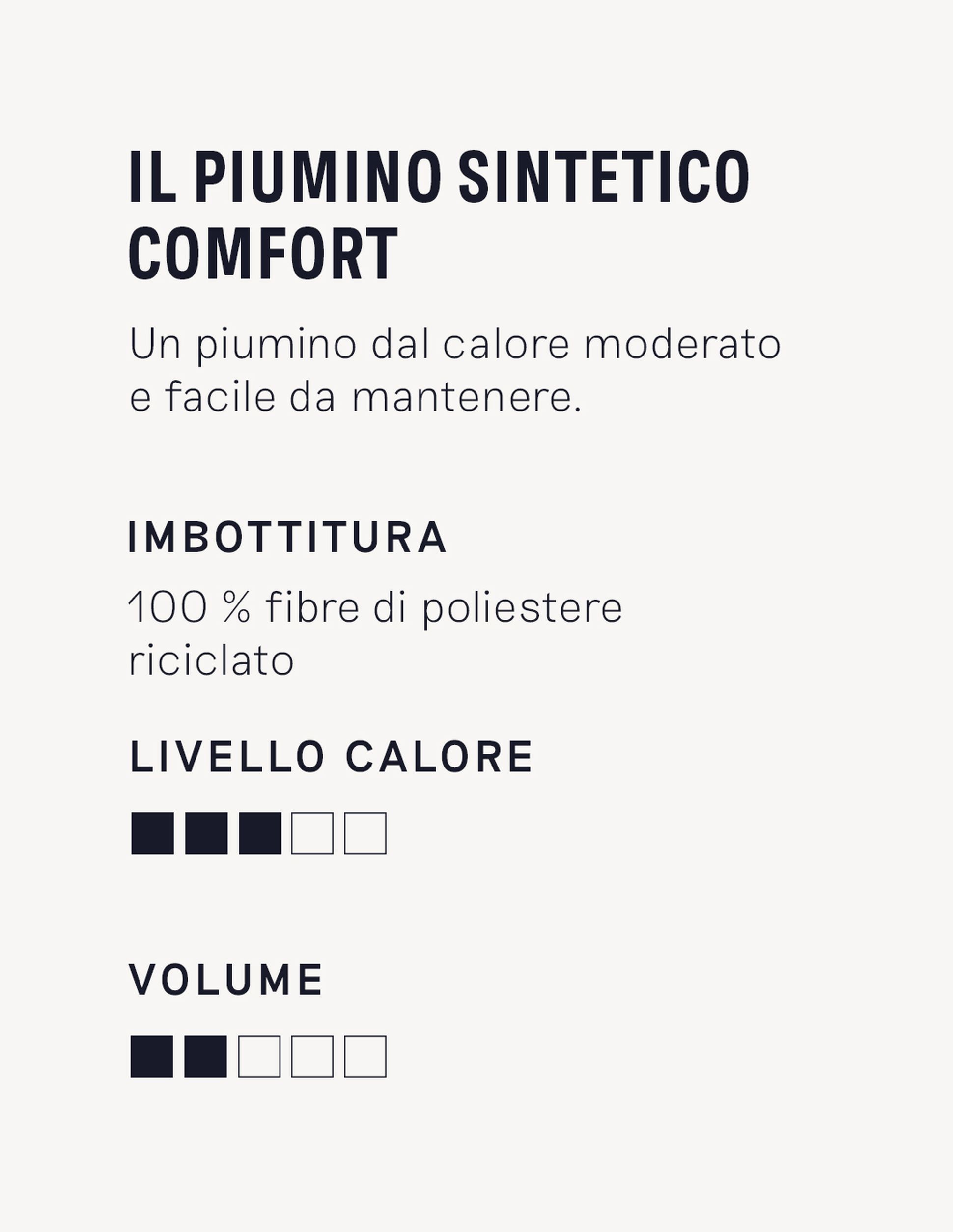I piumoni in fibre sintetiche sono anch’essi un’ottima scelta. Le fibre di poliestere 100% riciclate sono resistenti, durevoli e ipoallergeniche. Inoltre, sono ecologiche e contribuiscono a ridurre i rifiuti. La finitura prevede una fodera down-proof che impedisce alla piuma di fuoriuscire nel tempo.