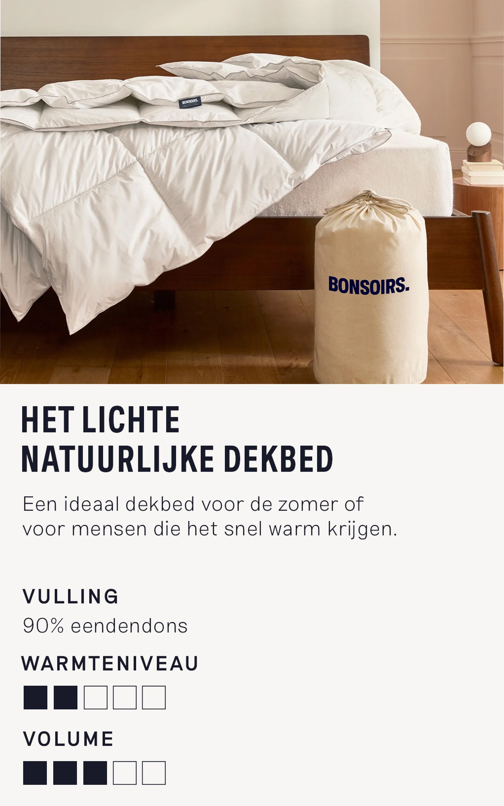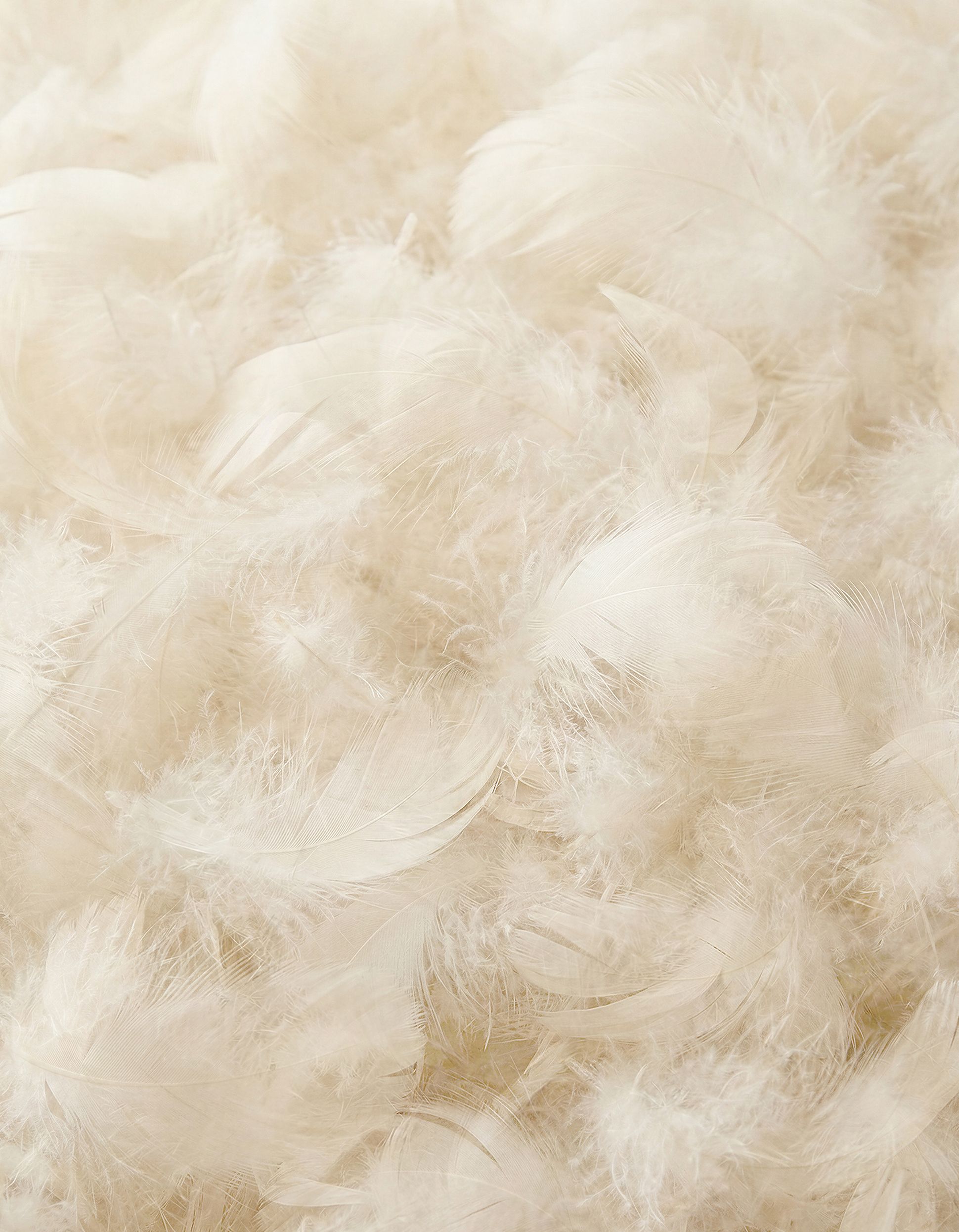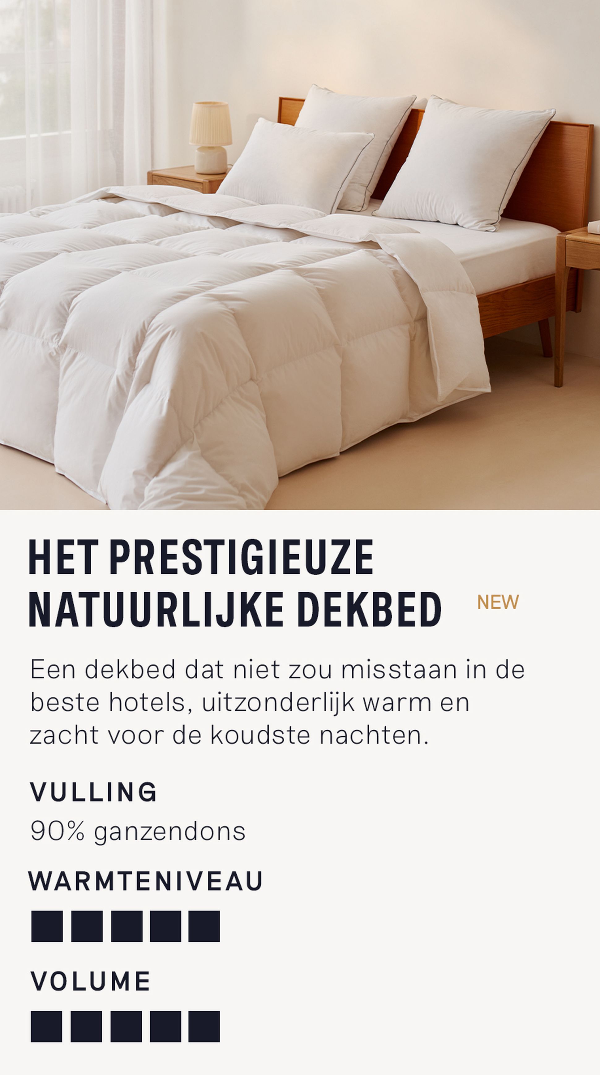 Onze natuurlijke vullingen combineren dons en kleine ganzenveren, geselecteerd op hun lichtheid, uitzonderlijke volume en natuurlijke temperatuurregulerende eigenschappen. Een luxueus, duurzaam materiaal dat uitsluitend afkomstig is van gerecyclede bronnen. We kopen ons dons en onze veren in bij een gecertificeerde leverancier (met het prestigieuze Franse label "Entreprise du Patrimoine Vivant") met 160 jaar ervaring in duurzame verenwinning.